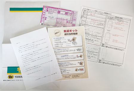 「コスクリ発送キット の内容」 1,ヤマト運輸 クロネコ袋 2,ヤマト運輸 送り状伝票 3,コスクリ ご挨拶文章 4,発送キット 送り方手順書 5,問診カルテ(見本) 6,問診カルテ